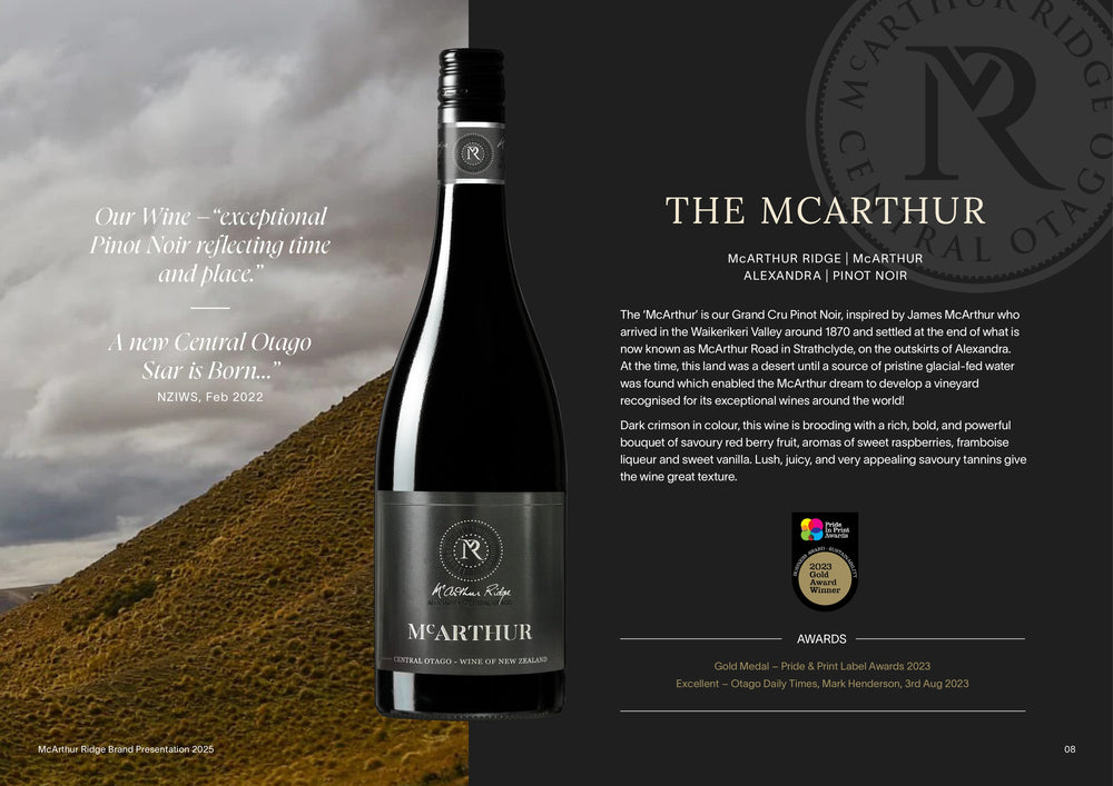 Around 1870 James McArthur arrived in the Waikerikeri Valley and settled at the end of what is now known as McArthur Road in Strathclyde, on the outskirts of Alexandra. At the time this land was a desert until a source of pristine glacial fed water was found which enabled the McArthur dream to develop a vineyard recognised for its exceptional wines around the world!